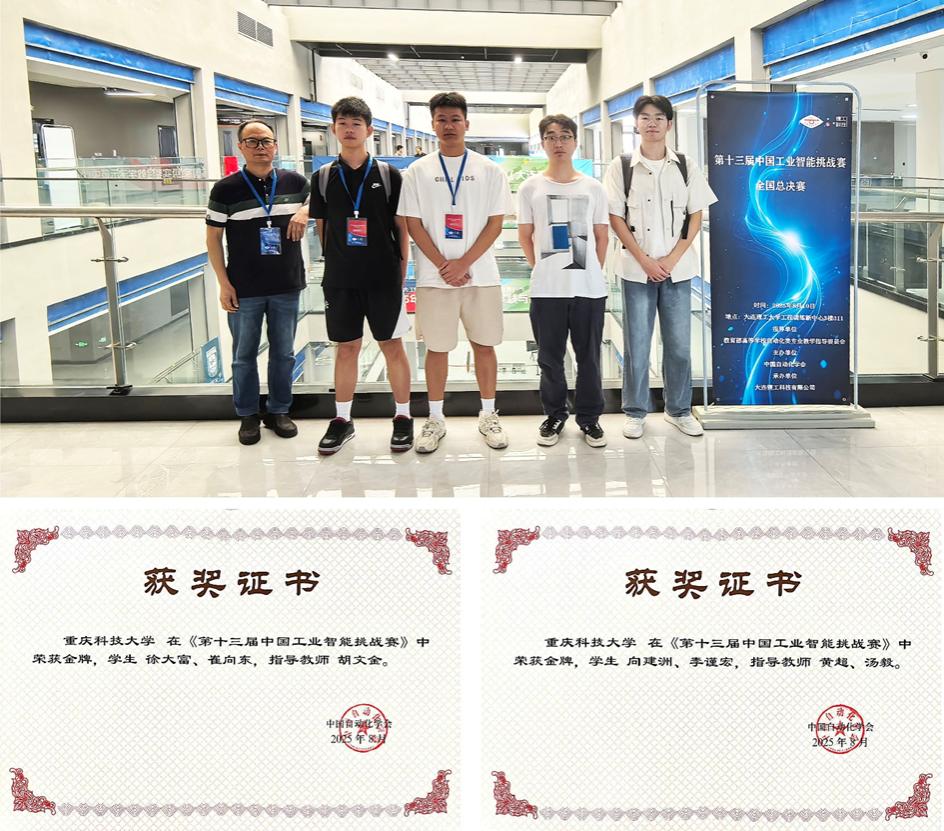 由教育部高等学校自动化类专业教学指导委员会指导、中国自动化学会主办、大连锂工科技有限公司承办的第十三届中国工业智能挑战赛全国总决赛近日在大连理工大学举行。我校电子与电气工程学院胡文金老师指导的参赛队(徐大富、崔向东),黄超老师和汤毅老师指导的参赛队(向建洲、李谨宏)双双荣获金奖。