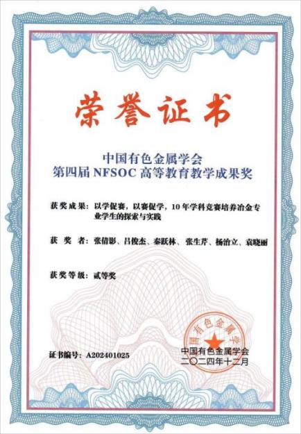 近日,中国科协主管的全国一级学会“中国有色金属学会”公布了第四届NFSOC高等教育教学成果计划入选项目名单,全国共有22所高校的37项成果入选,实验室教师张倩影副教授、吕俊杰教授牵头申报的《以学促赛,以赛促学,10年学科竞赛培养冶金专业学生的探索与实践》项目荣获中国有色金属学会高等教育教学成果二等奖,这是我院继2022年获得该学会教学成果一等奖之后,时隔两年第二次在该学会获奖。