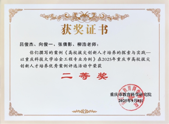 近日,“重庆市高校拔尖创新人才培养优秀案例评选活动”结果揭晓,实验室吕俊杰教授等选送的案例《高校拔尖创新人才培养的探索与实践—以重庆科技大学冶金工程专业为例》荣获二等奖。