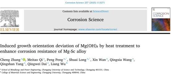 近日,实验室青年教师张诚在材料科学领域国际Top期刊《Corrosion science》(中科院一区,影响因子8.5)发表题为《Induced growth orientation deviation of Mg(OH)₂ by heat treatment to enhance corrosion resistance of Mg-Sc alloy》的高水平学术论文。我校冶金与动力工程学院为第一完成单位,张诚为第一作者,彭鹏和龙帅为共同通讯作者。